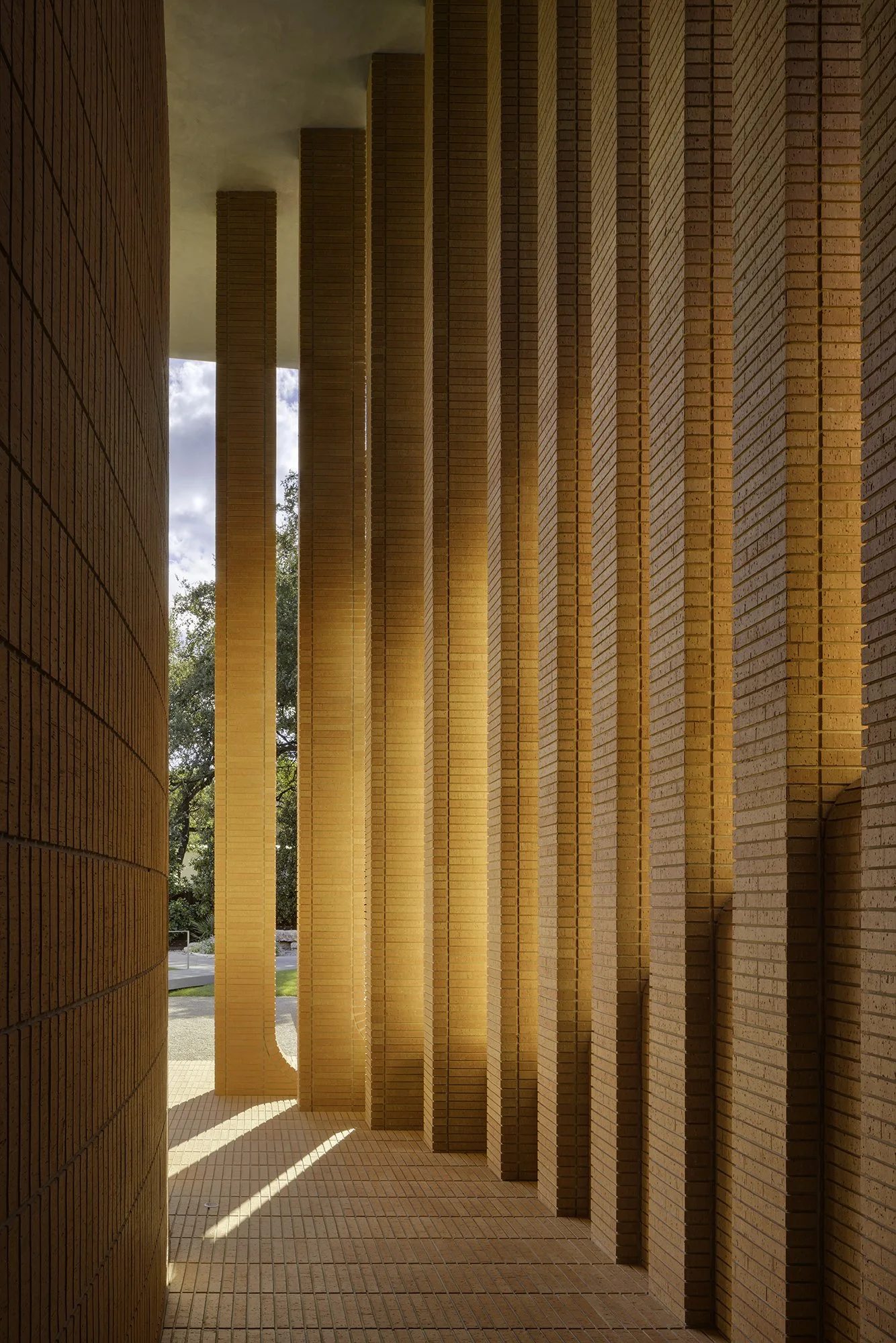 The arrival sequence includes a winding driveway leading to a dramatic entrance defined by 25-foot-tall brick columns, evoking the sensation of walking through a narrow canyon. These columns extend into stairs, retaining walls, and planters that visually anchor the structure to the sloping site.