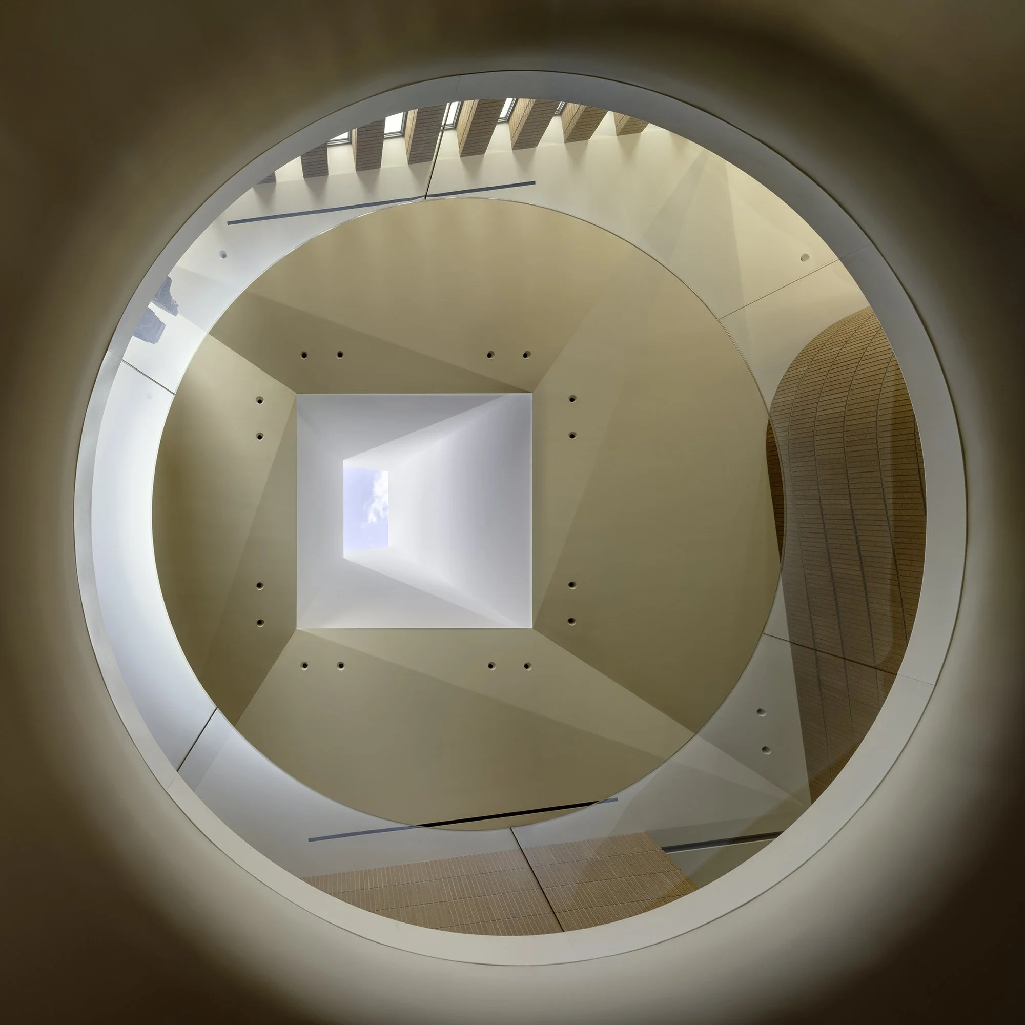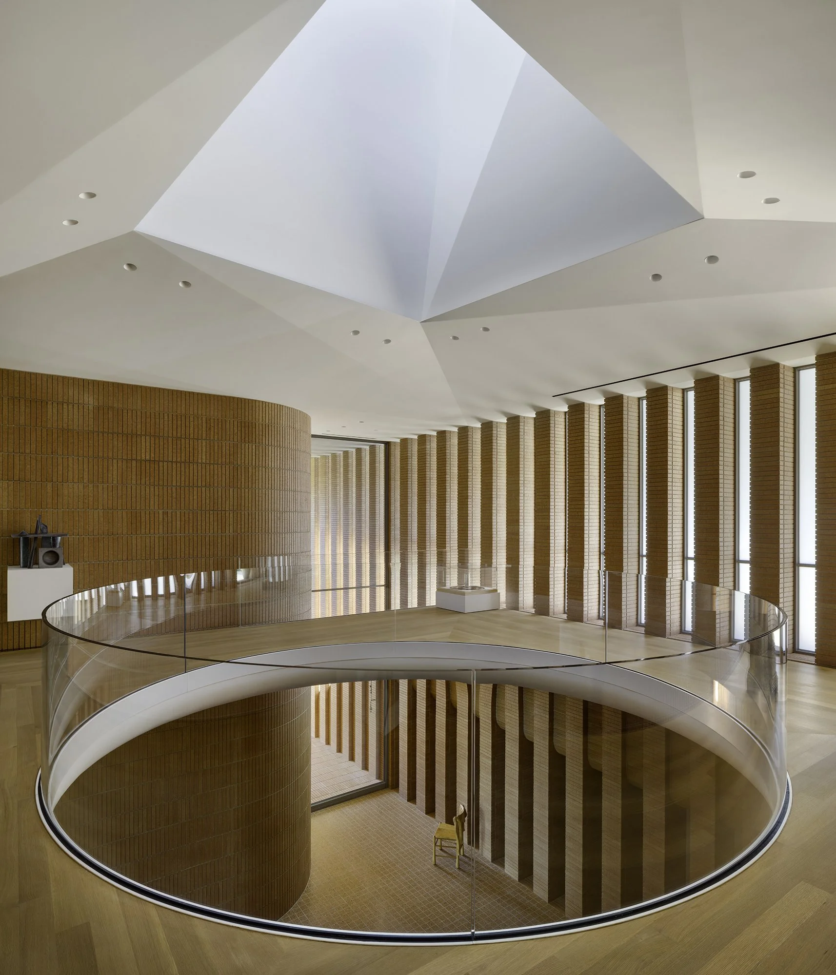Inside, a central atrium offers a spatial release, with a sloped plaster ceiling rising to a round oculus and a 40-foot-high skylight formed by folded planes. This vertical volume becomes a defining exterior spire, while the floor plan radiates outward from this core, organized by four axial masonry walls: The screen wall, lined with vertical windows, filters western sunlight. The wave wall subtly curves through the public spaces and aligns with a bald cypress tree, ending at a sculptural art studio. The stair wall follows a wooden staircase that echoes the brick’s proportions. The privacy wall separates service and guest areas from the main spaces.